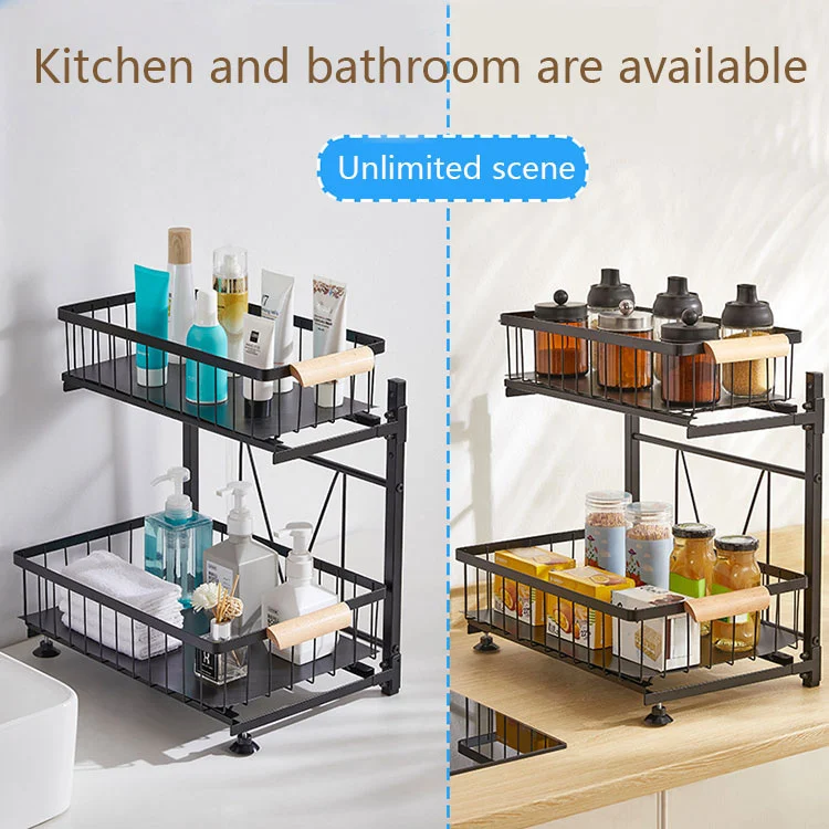 2. Agregar accesorios para mejorar la textura: Nuestros diseñadores han agregado mangos de madera como accesorios para hacer que todo el producto sea más interesante. Cuando se tira, tiene una sensación agradable y se agrega papel de revestimiento adicional en el fondo de la canasta para evitar que los artículos pequeños se resbalen. También se puede ajustar la altura de los pies de la base. Si se usa en el baño, no hay necesidad de preocuparse de que los elementos colocados entren en contacto con el agua de la encimera.